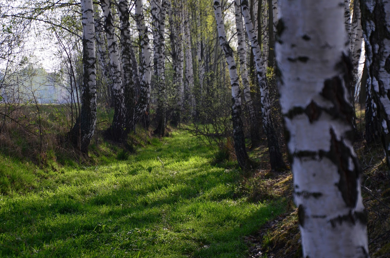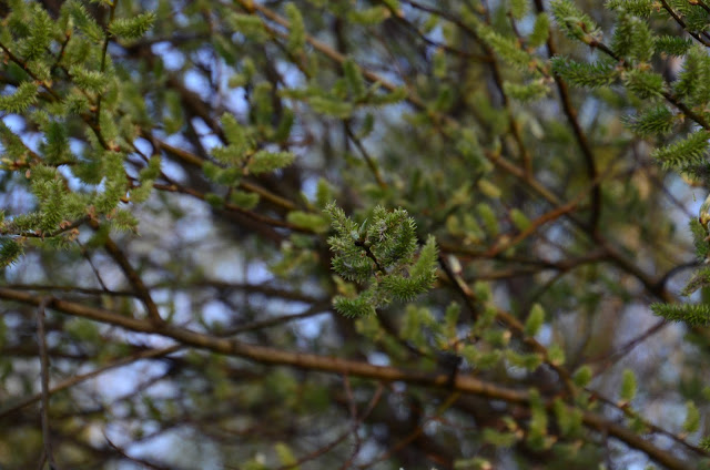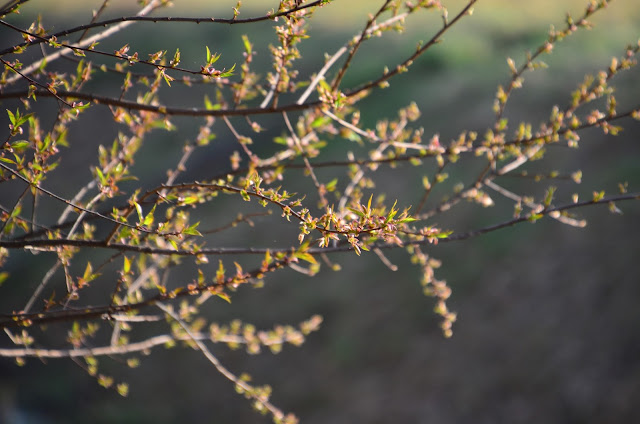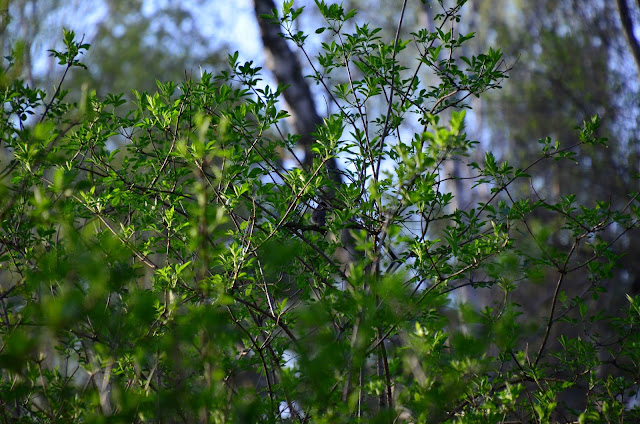 Przedzieram się przez krzaki, na których już pojawiają się zieleniące świeżą zielenią listki.