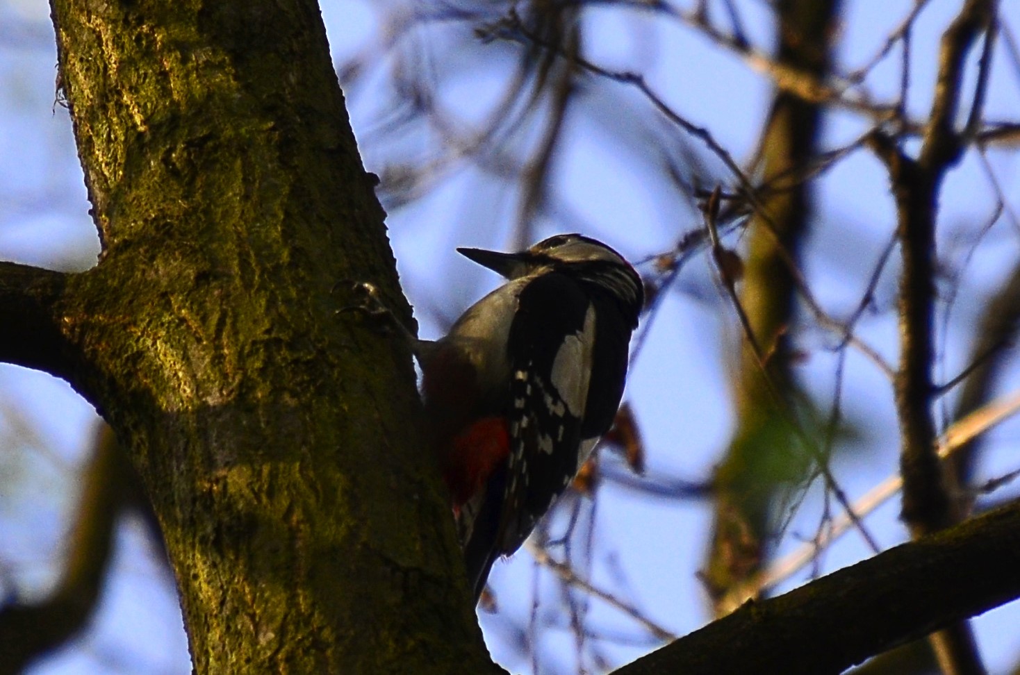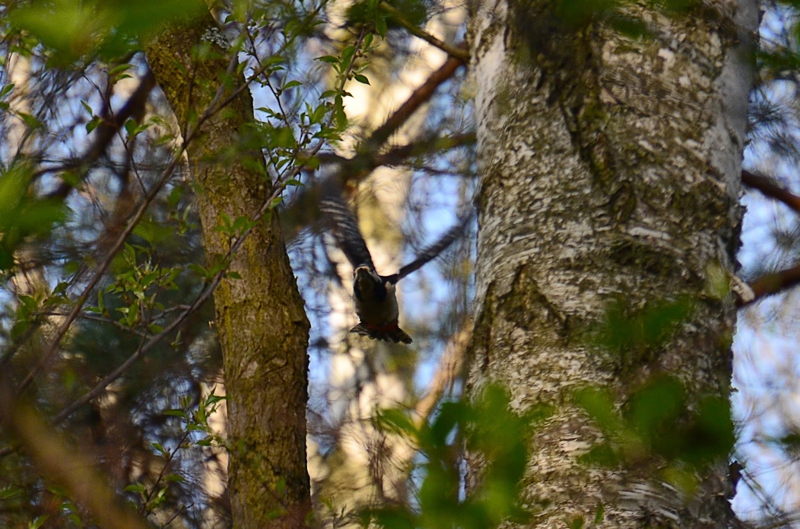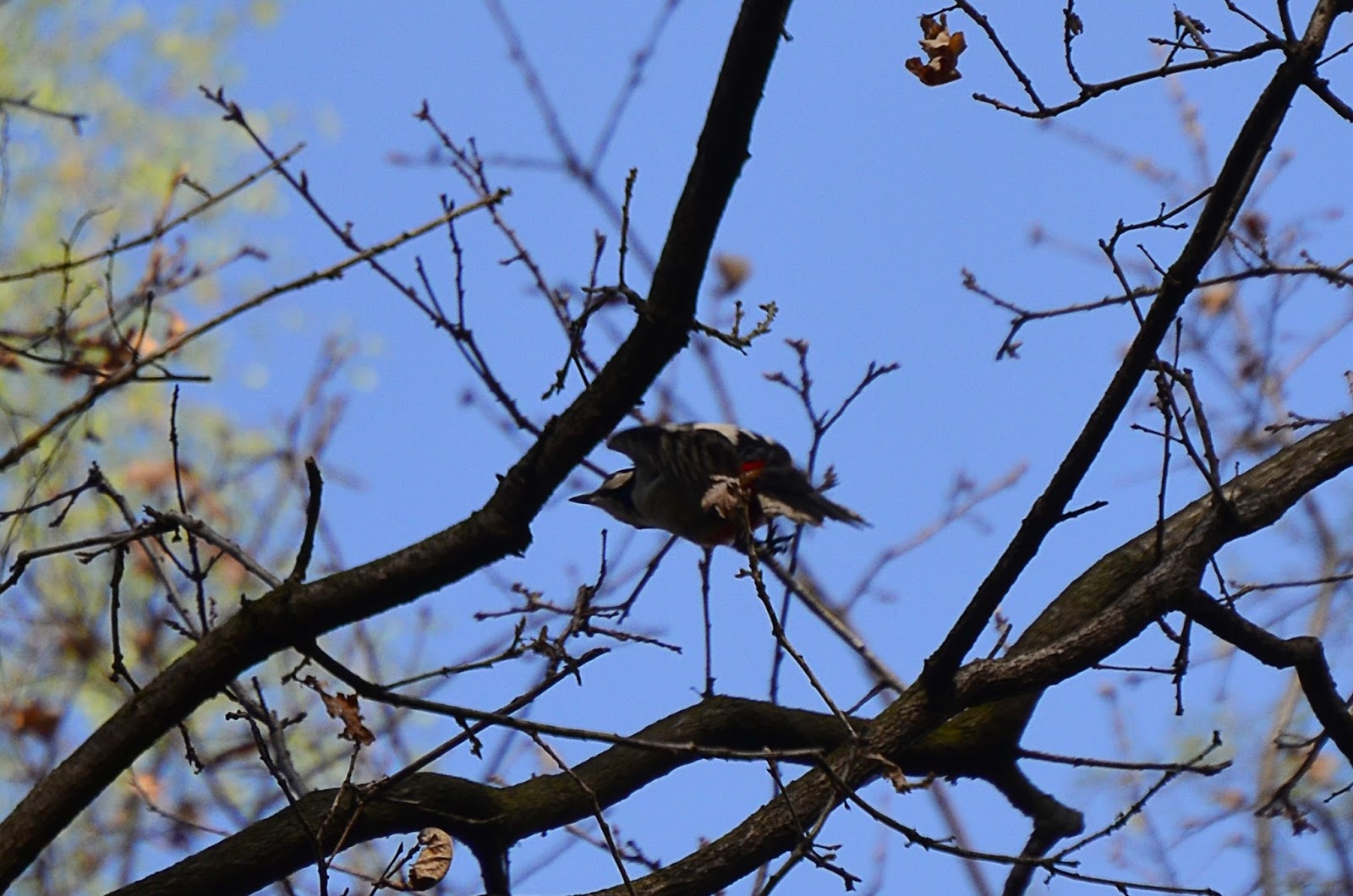 Pierwszy raz słyszę jakie odgłosy wydają dzięcioły w locie – krzyczą na całego… A ja myślałam, że tylko stukają w pnie… Bębnienie też z rzadka słychać, ale przede wszystkim pokrzykują latając pośród drzew. Trudno je namierzyć w bezruchu, ponieważ przysiadają na drzewie tylko na chwilę.