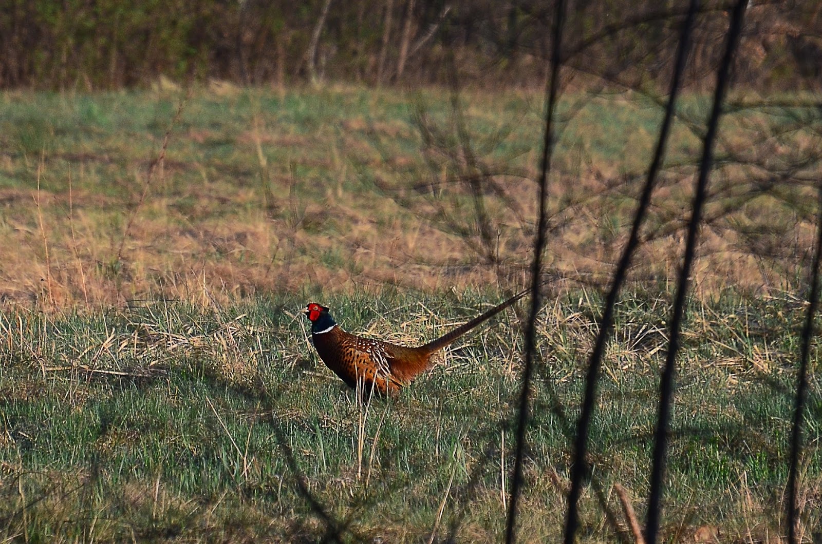 W pewnym momencie słyszę charakterystyczny krzyk bażanta. Widzę go – to samiec bażanta (Phasianus colchicus). Jest daleko i już mnie zauważył, więc strategicznie zaczyna się się wycofywać. Zamieram. Czekam, tak żebym mu się rozmyła w bezruchu. Widzę, że stracił zainteresowanie nieporuszającym się obiektem i zaczyna skubać trawę. Zaczynam podchodzić – bażant patrzy. Stoję – on je. Idę – patrzy, stoję – dziobie itd. Mija parę minut podczas, których udaje mi się zbliżyć do niego na odległość fotograficzną. Robię parę zdjęć.