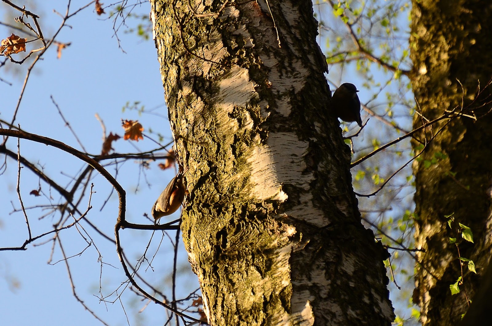 Idę dalej. Nagle na pniu srebrzącej się brzozy widzę kowaliki (Sitta europaea).